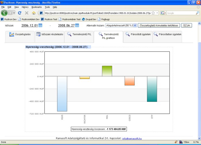 A részletezések között megtalálható az időszaki, termék szintű és ügyletenkénti megjelenítés is. Az időszaki részletezés felbontása év-hónap-hét-nap szinten állítható, és az adott időszaki áltagos bekerülési érték, nyereség és hozam mellett megjeleníti az alternatív befektetéshez képest elért többlethozamot is.
